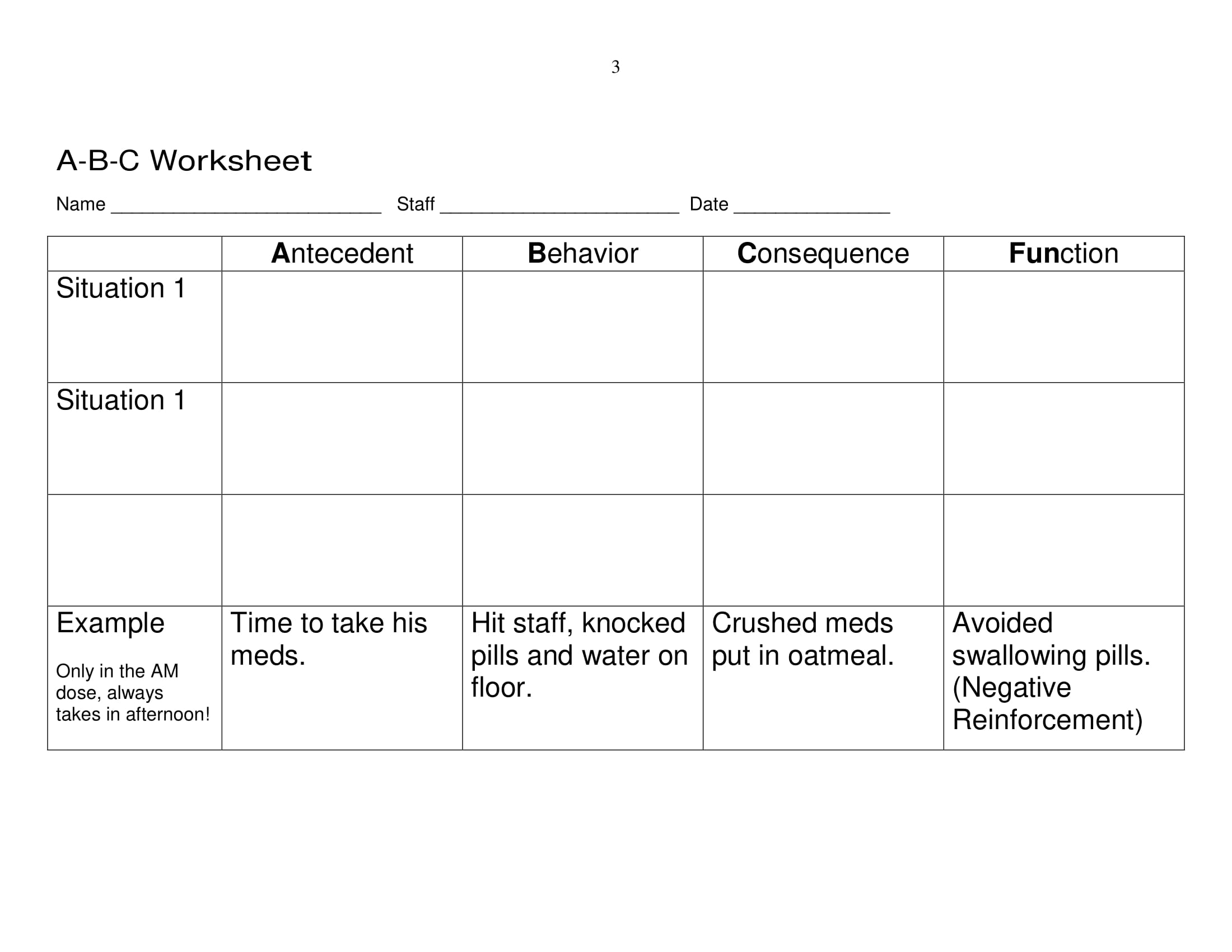 These worksheets typically consist of three columns: Antecedent, Behavior, and Consequence. In the Antecedent column, the individual notes what was happening right before the behavior occurred. This could include things like a specific event, a certain person’s presence, or a particular environment. The Behavior column is where the actual behavior is described in detail, including its duration, intensity, and frequency. Finally, the Consequence column outlines what happened immediately after the behavior, such as a reward, punishment, or no reaction at all.