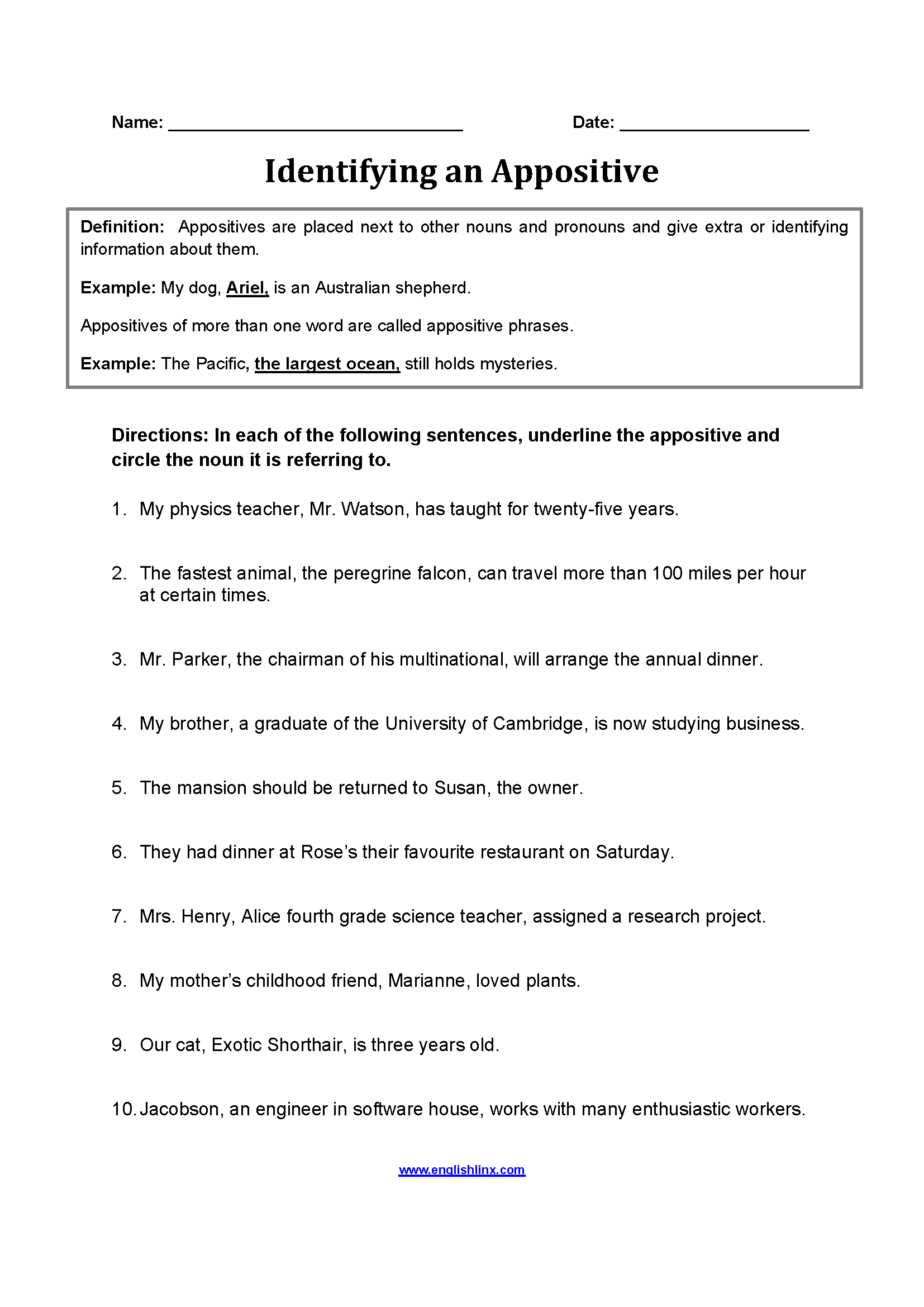 One common type of appositive worksheet is to provide a sentence with a missing appositive, and students are required to identify the noun that needs an appositive and then write an appropriate appositive phrase. For example, a sentence may read, “The teacher handed the book to Sarah.” Students would need to add an appositive to identify who Sarah is, such as “The teacher handed the book to Sarah, his favorite student.”