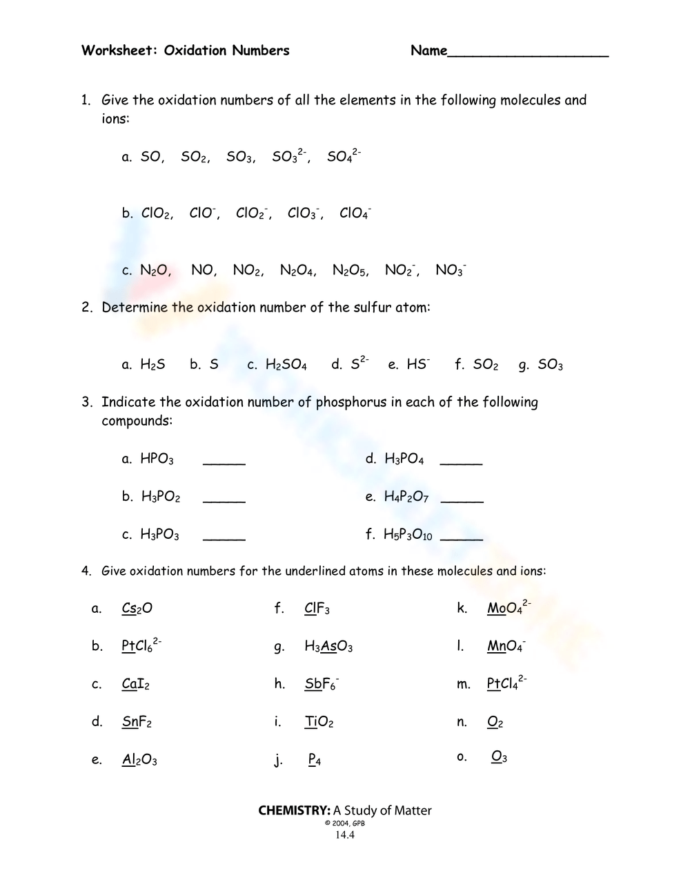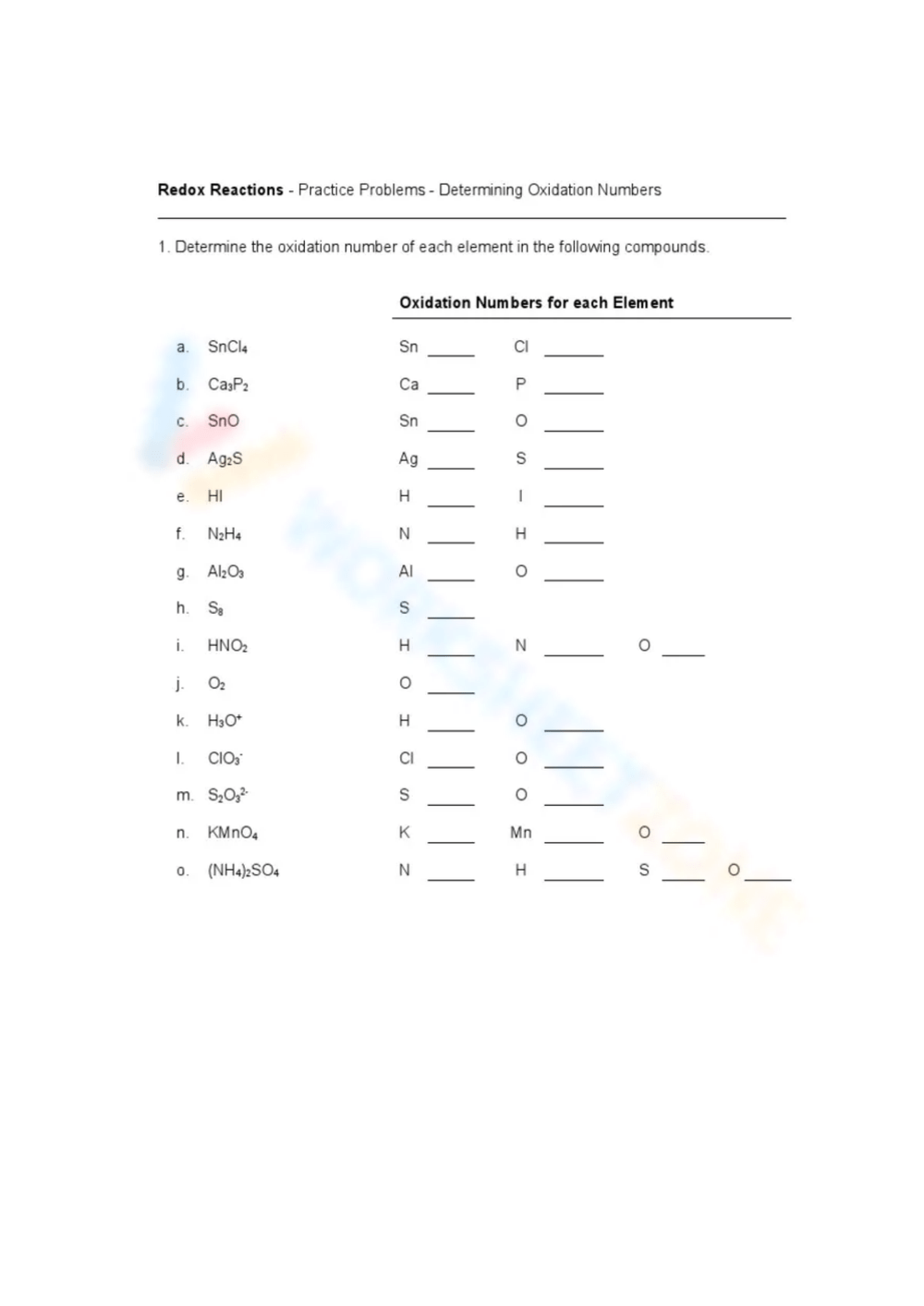 Another important skill that students can develop through a worksheet on assigning oxidation numbers is balancing redox reactions. By assigning oxidation numbers to the reactants and products, students can identify which atoms are being oxidized and reduced. This information is crucial for balancing the reaction by ensuring that the number of electrons lost in oxidation equals the number gained in reduction.