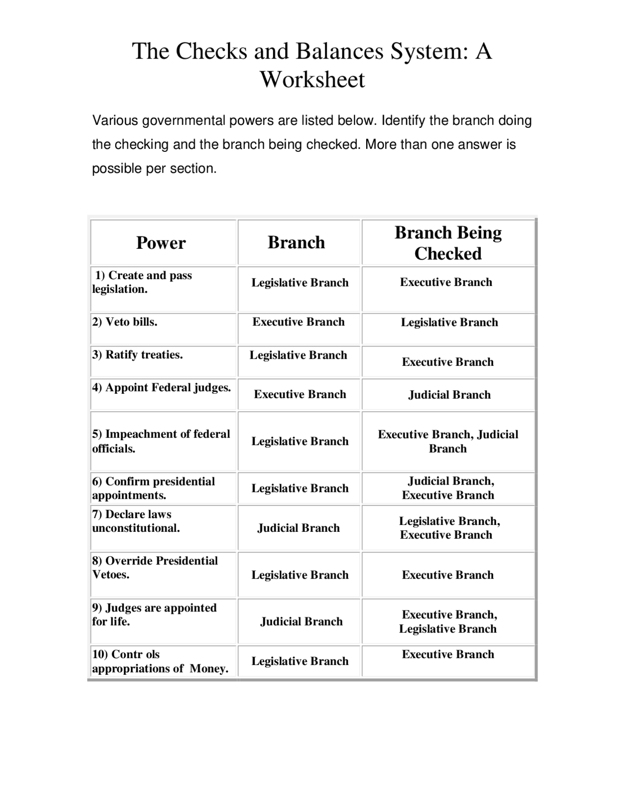 Some worksheets may also include questions about the system of checks and balances as a whole, such as why it is important for a democratic government or how it helps prevent abuse of power. These types of questions can help students think critically about the role of government and the importance of having a system of checks and balances in place.