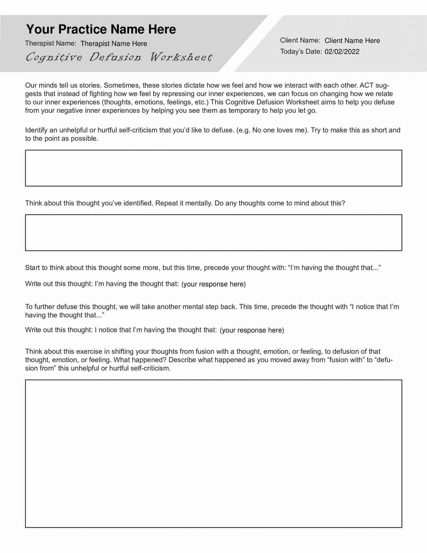 One common exercise found in cognitive defusion worksheets is the “thought challenging” technique. This involves asking individuals to identify a negative thought, consider evidence that supports and contradicts that thought, and come up with a more balanced and realistic alternative.