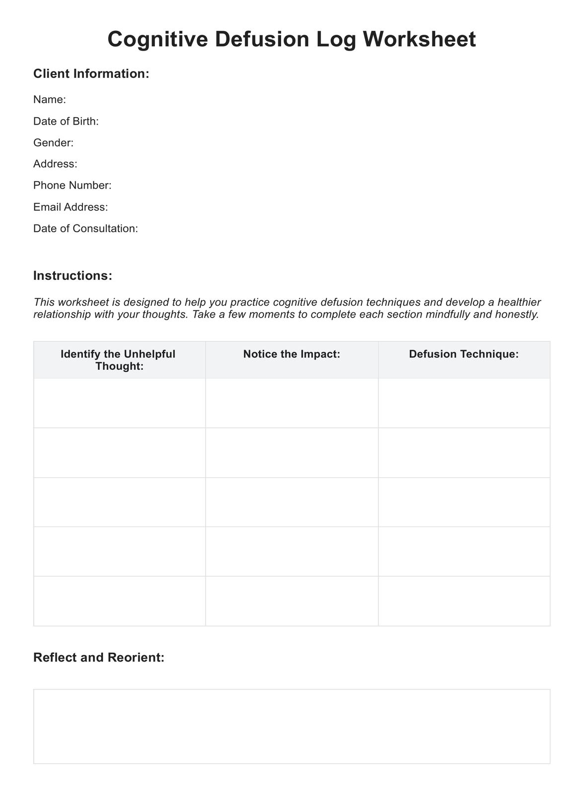 Cognitive Defusion Worksheet