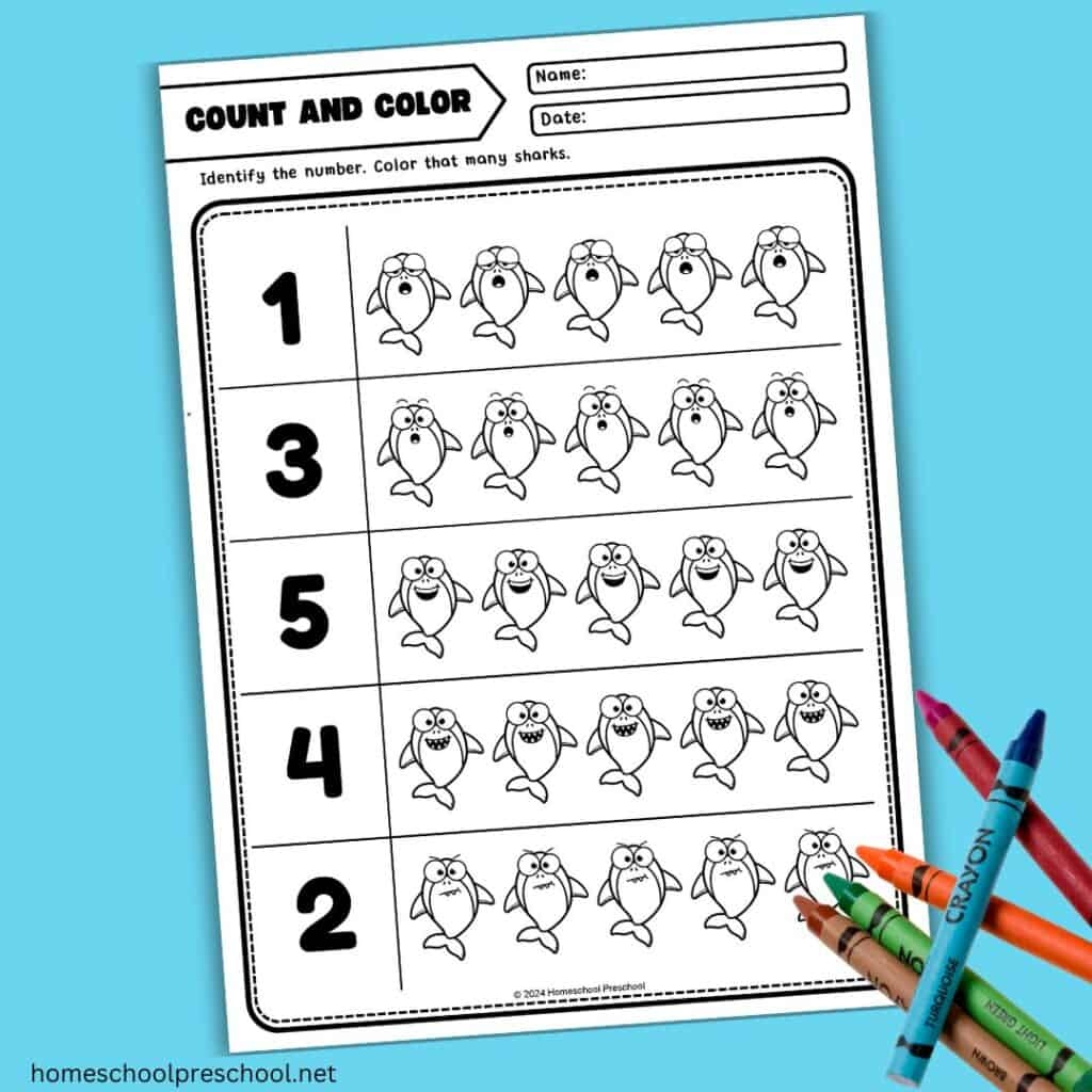 Counting shark worksheets typically feature images of different types of sharks, along with numbers that correspond to each shark. Children are tasked with counting the number of sharks in each picture and writing down the correct number. This helps them develop their counting, number recognition, and writing skills in a fun and engaging way.
