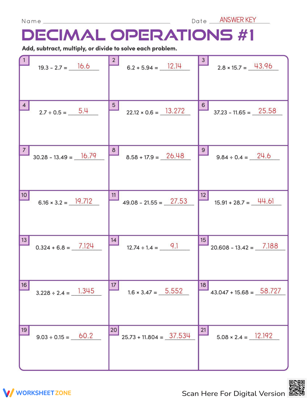 Decimal operations are essential mathematical skills that students need to master. A decimal operations worksheet is a valuable tool that can help students practice and improve their abilities in adding, subtracting, multiplying, and dividing decimals. These worksheets provide a structured format for students to work through various problems and develop a deeper understanding of decimal operations.