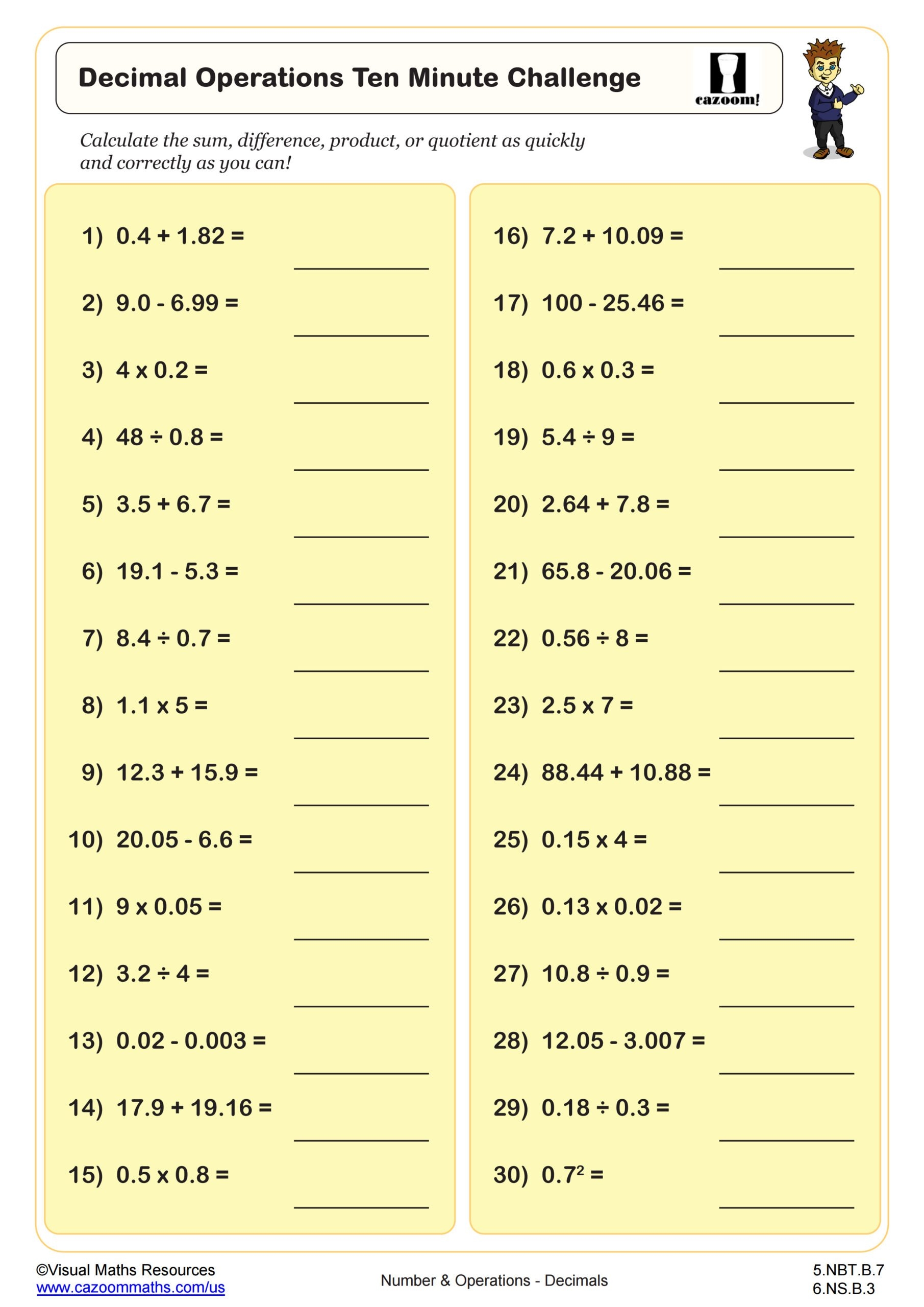 Decimal Operations Ten Minute Challenge Worksheet Fun And