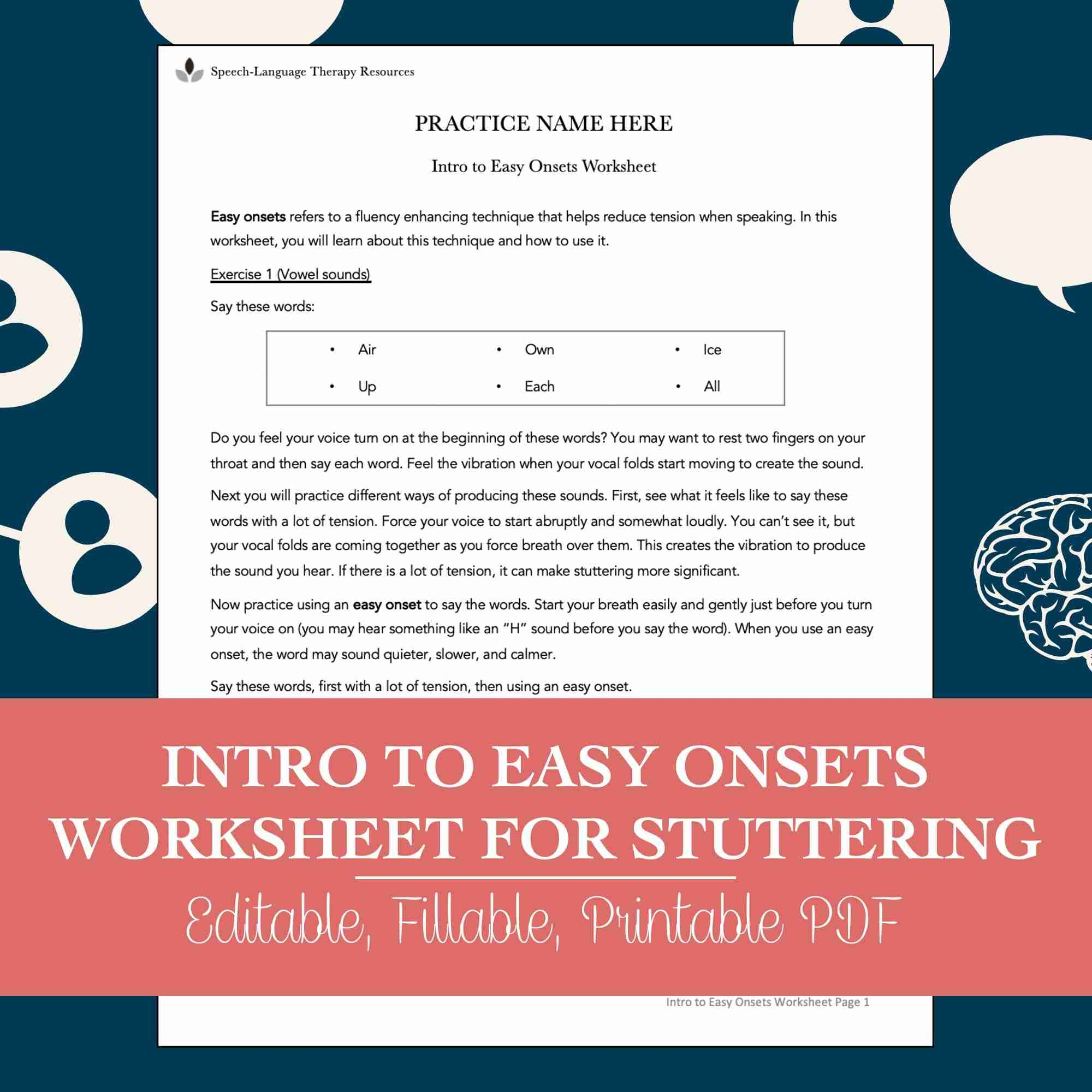 Easy onset stuttering worksheets are free resources that can be accessed online or through speech therapy programs. These worksheets typically include exercises and activities that focus on techniques such as gentle starts, relaxed breathing, and smooth transitions between words. By practicing these techniques regularly, individuals can train their speech muscles to produce more fluent speech and reduce instances of stuttering.
