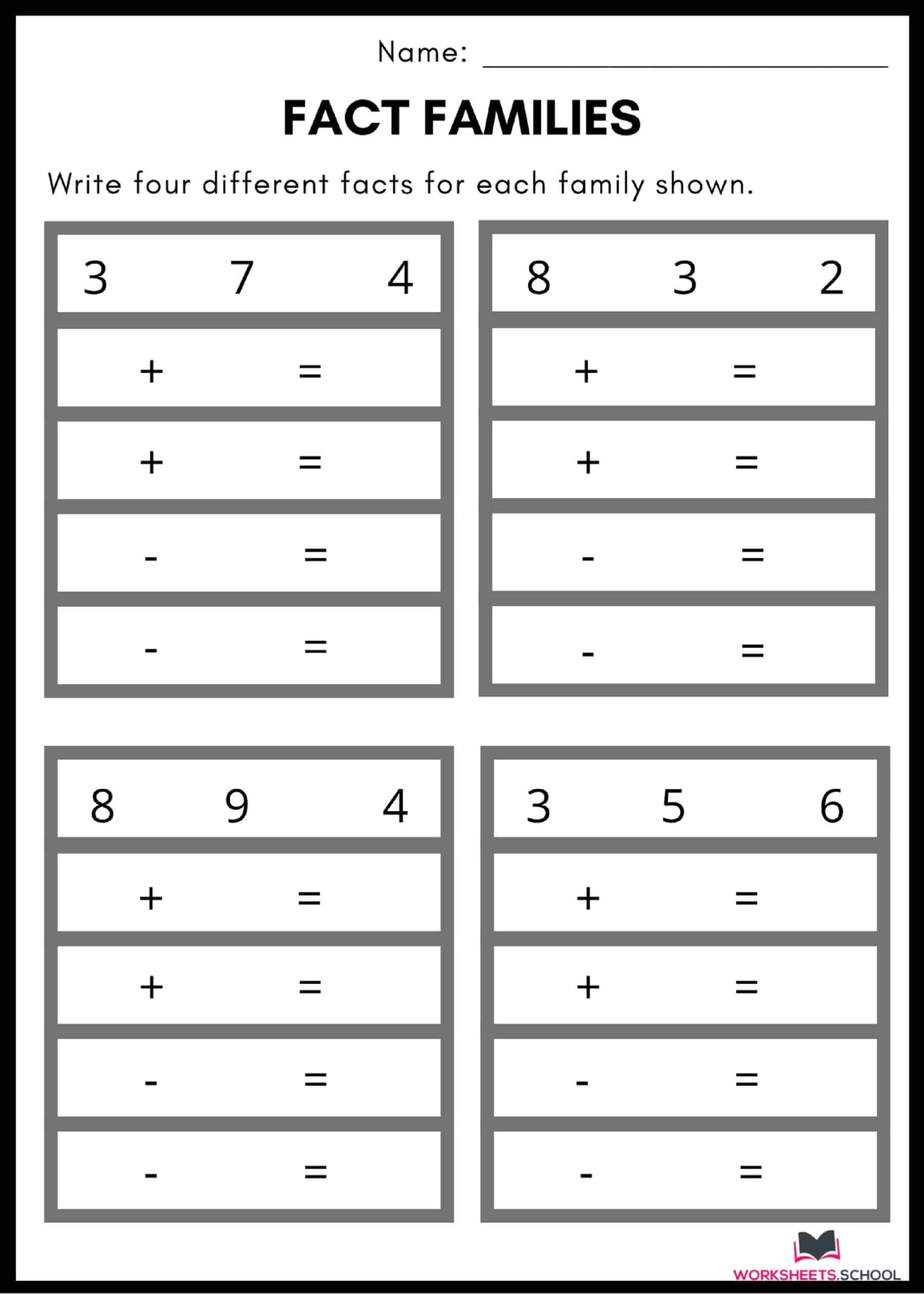 Fact families worksheets typically consist of sets of related equations that involve addition and subtraction. For example, a fact family might include the following equations: 2 + 3 = 5, 3 + 2 = 5, 5 – 2 = 3, and 5 – 3 = 2. By working through these equations, students can see how numbers can be combined and separated to create different expressions.
