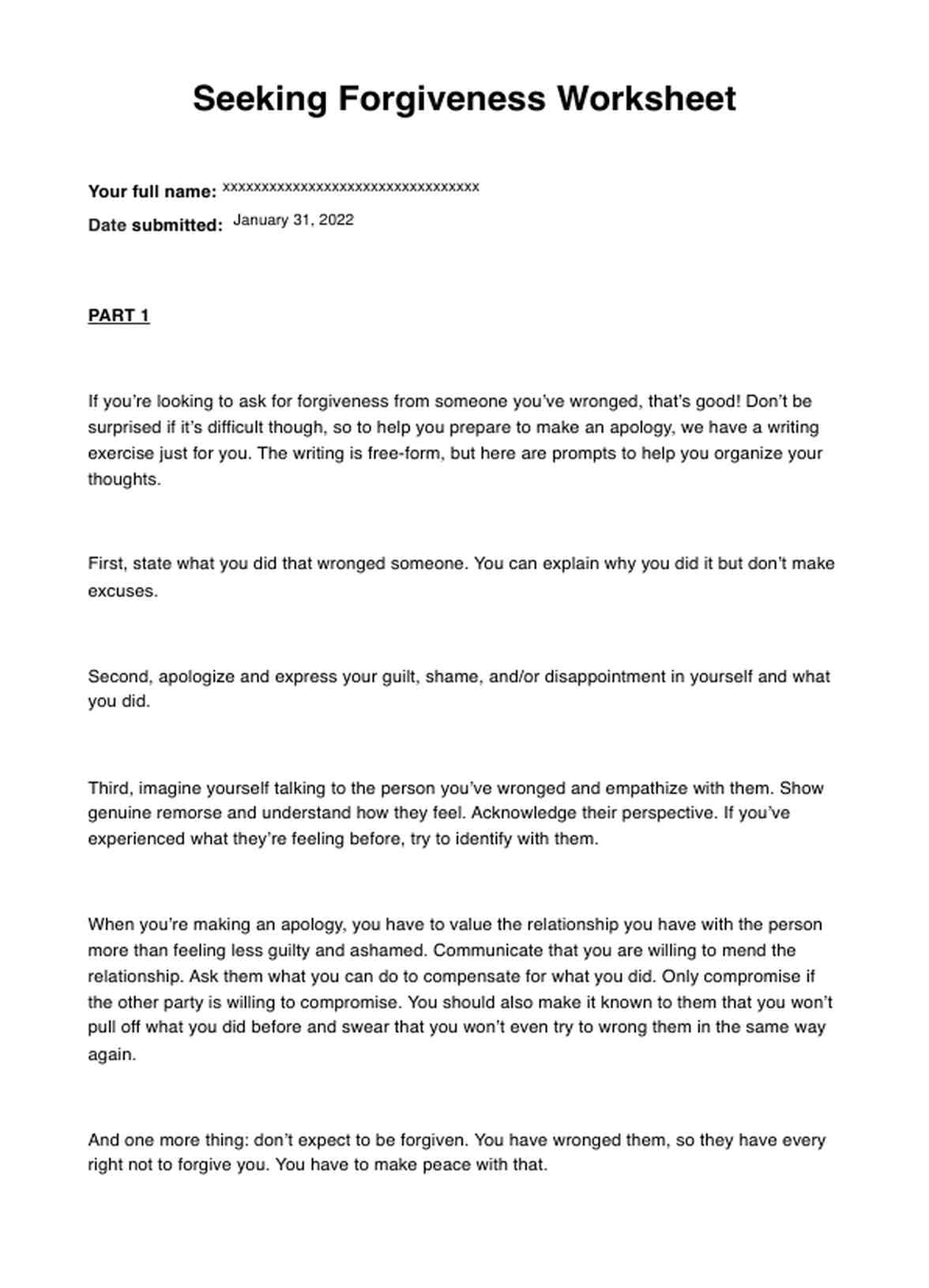 Forgiveness worksheets provide individuals with a framework to explore their thoughts and feelings about the person or situation they are seeking to forgive. These worksheets often include prompts and exercises that encourage individuals to reflect on their emotions, identify any lingering resentment or anger, and work towards letting go of these negative feelings.