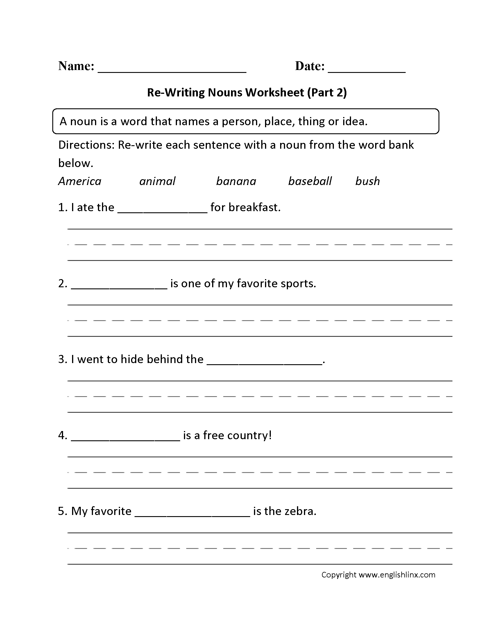 Worksheets are a valuable tool for educators to assess students’ knowledge and provide additional practice. Nouns worksheets can be tailored to different levels of proficiency, making them suitable for students of all ages. These worksheets often include exercises that require students to identify nouns in sentences, categorize nouns by type, and create sentences using nouns.