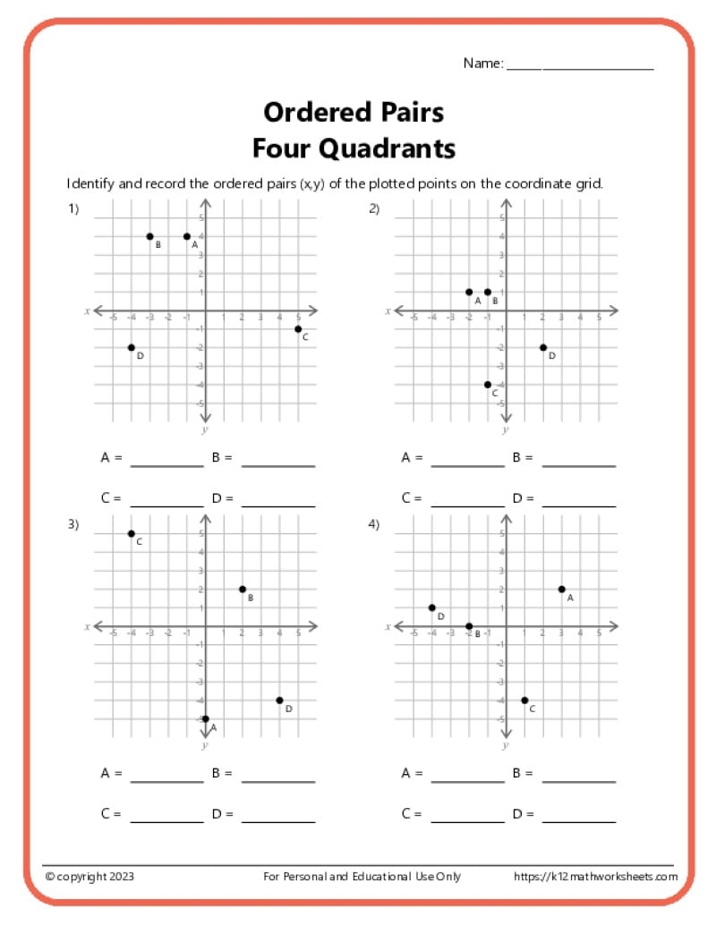 A worksheet on ordered pairs can help students practice plotting points on a graph, identifying coordinates, and understanding how to read and interpret ordered pairs. These worksheets typically include a variety of exercises that range from basic to more complex, allowing students to gradually build their skills and confidence in working with ordered pairs.