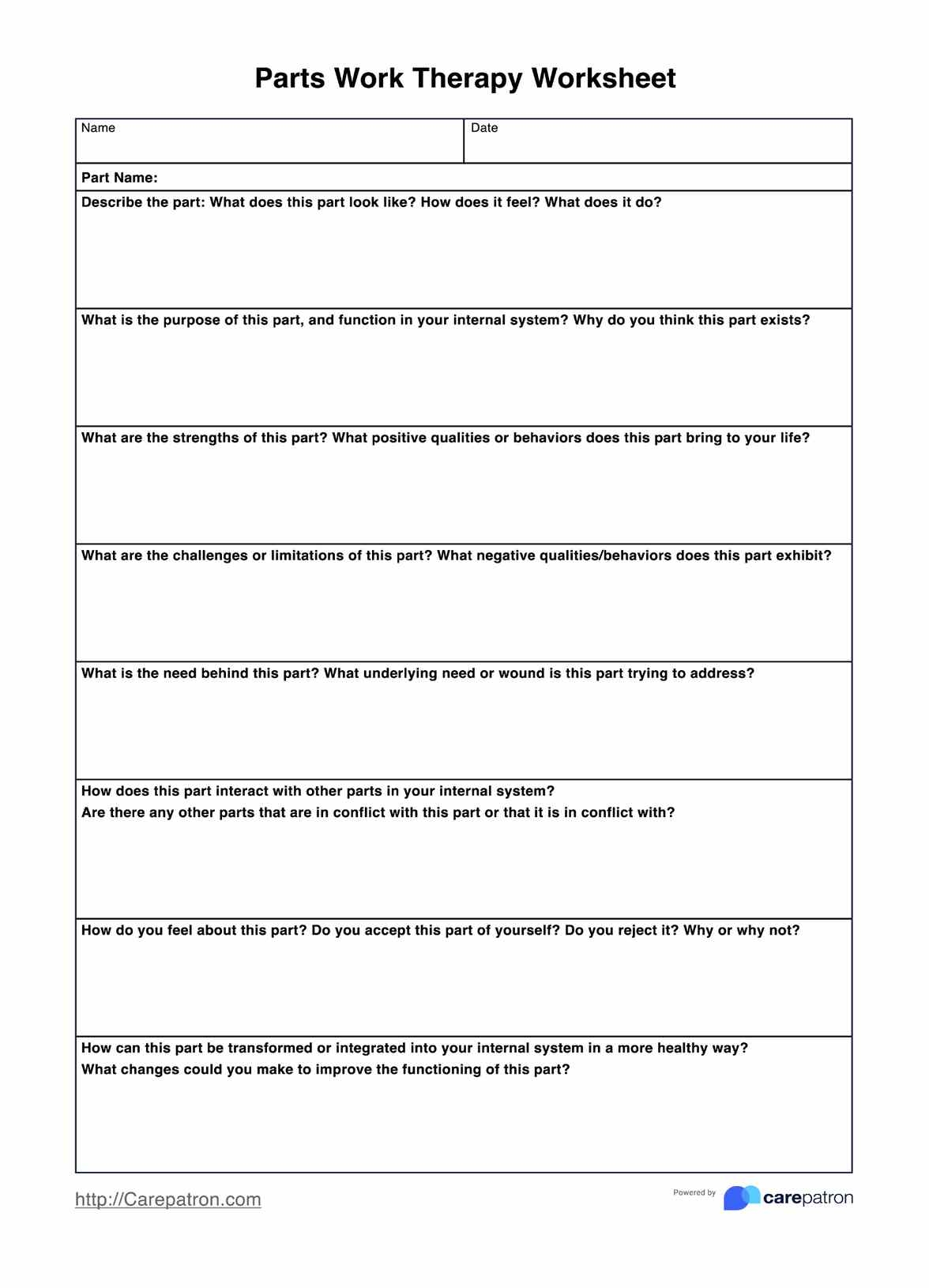 Parts work therapy worksheets typically include exercises such as journal prompts, guided visualizations, and structured questions to help individuals connect with and understand their internal parts. These worksheets often encourage individuals to explore the emotions, beliefs, and behaviors associated with different parts of themselves, as well as to identify any conflicts or contradictions between these parts.