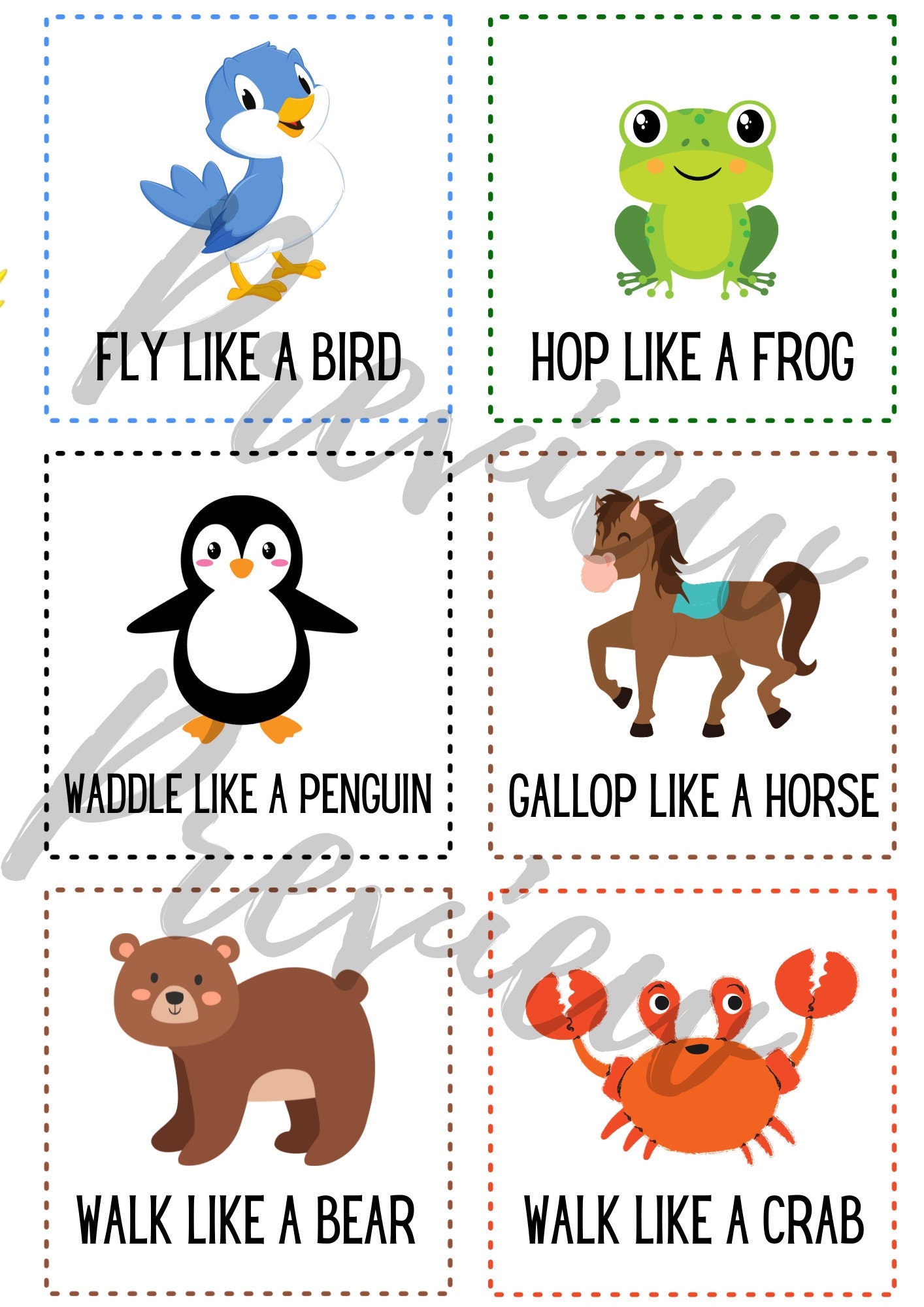 These printable animal walk cards typically feature a picture of an animal along with a description of the movement that corresponds to that animal. For example, a card might show a picture of a frog and the movement might be hopping like a frog. Kids can then mimic the movements as they walk around, getting exercise while learning about different animals.