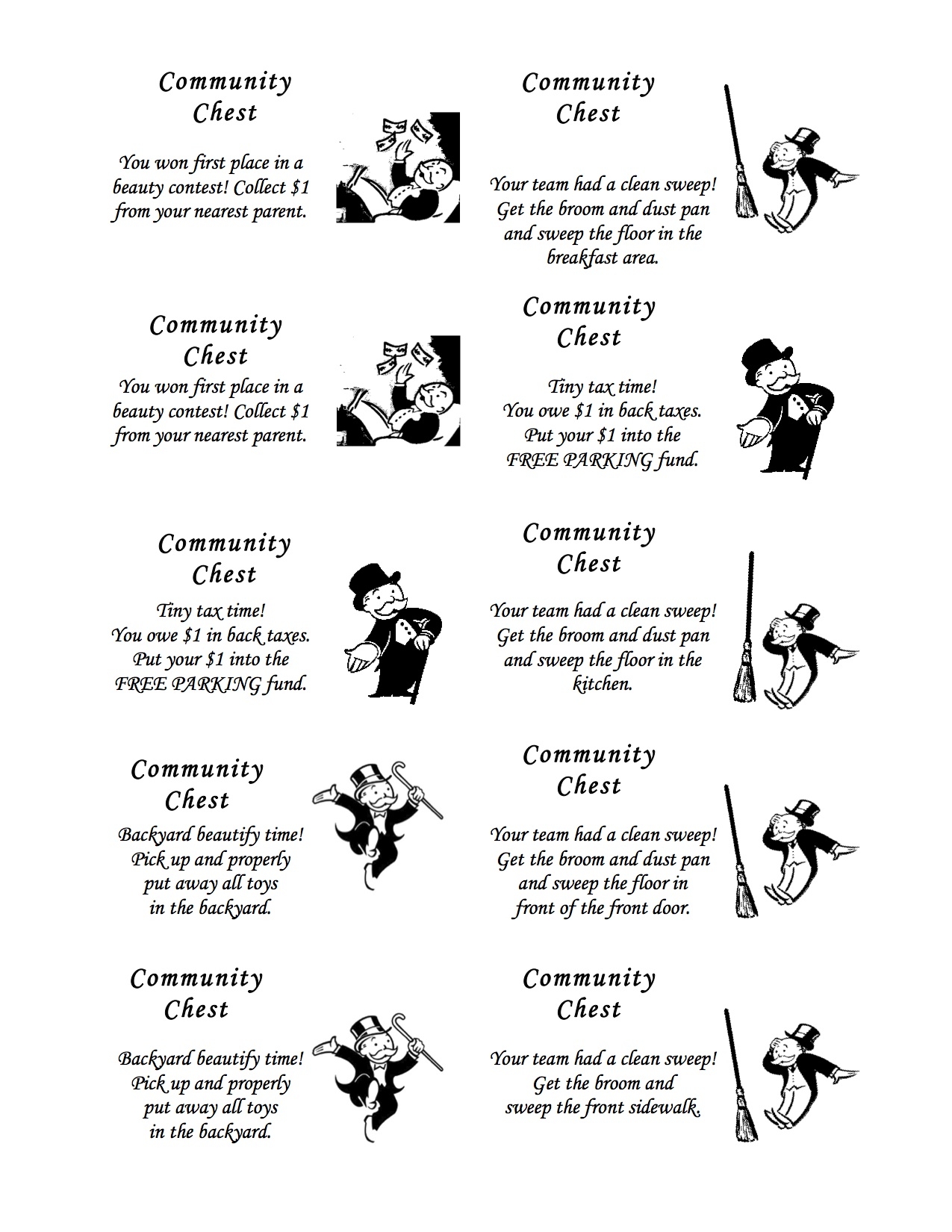 In conclusion, printable Chance and Community Chest cards are a wonderful way to enhance the Monopoly experience. Whether you’re looking to add a personal touch to your game, refresh an old set, or incorporate Monopoly into your lesson plans, printable cards are a versatile and fun option. So why not give them a try and see how they can take your Monopoly game to the next level!