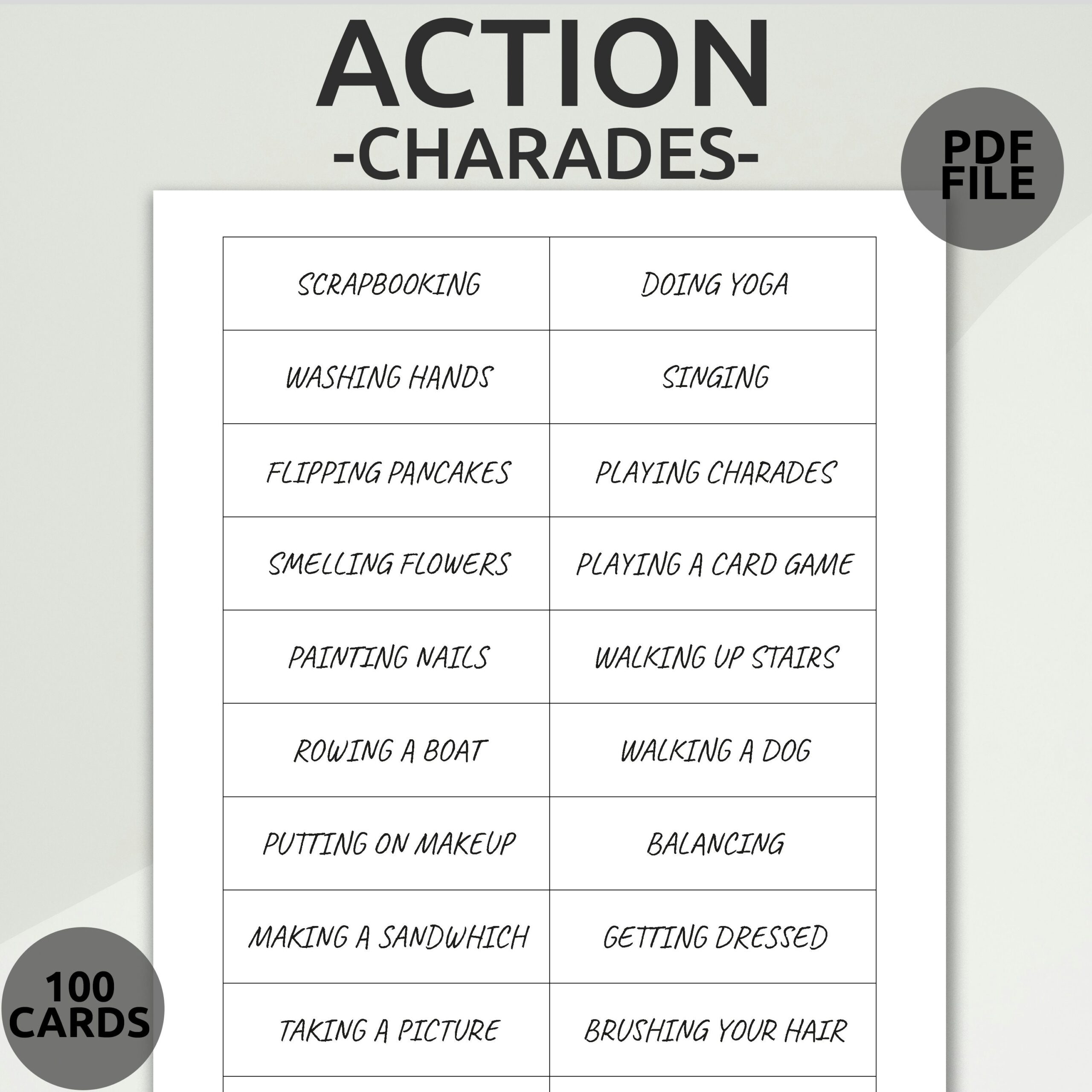 Charades is a classic party game that is fun for all ages. It involves acting out a word or phrase without speaking, while others try to guess what it is. Printable charade cards can add a new level of excitement to the game, making it easy to come up with ideas and keep the game fresh.
