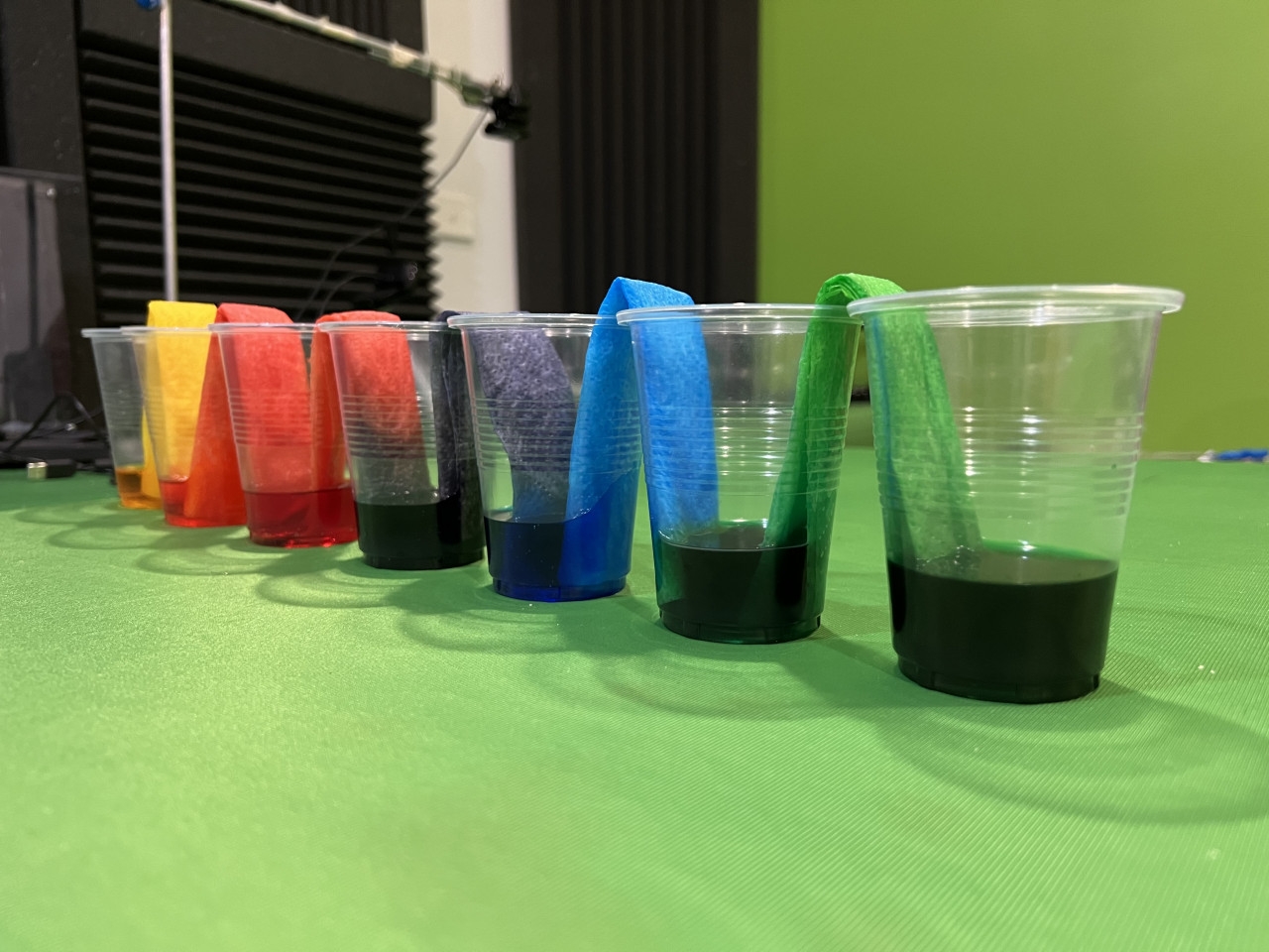 Start by placing six empty cups in a row and filling every other cup with water and food coloring. Then carefully place a paper towel strip connecting the cups with colored water to the empty cups. Watch as the water “walks” along the paper towel through capillary action, mixing colors as it goes.