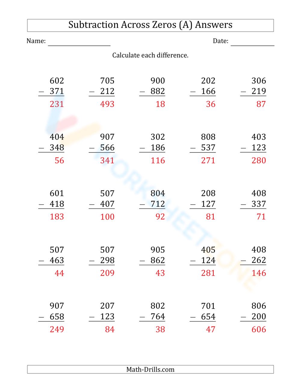 Another type of problem found on these worksheets is when students need to subtract numbers with multiple zeros in different places. This challenges students to pay close attention to the placement of each zero and ensure they are subtracting correctly to get the accurate answer.